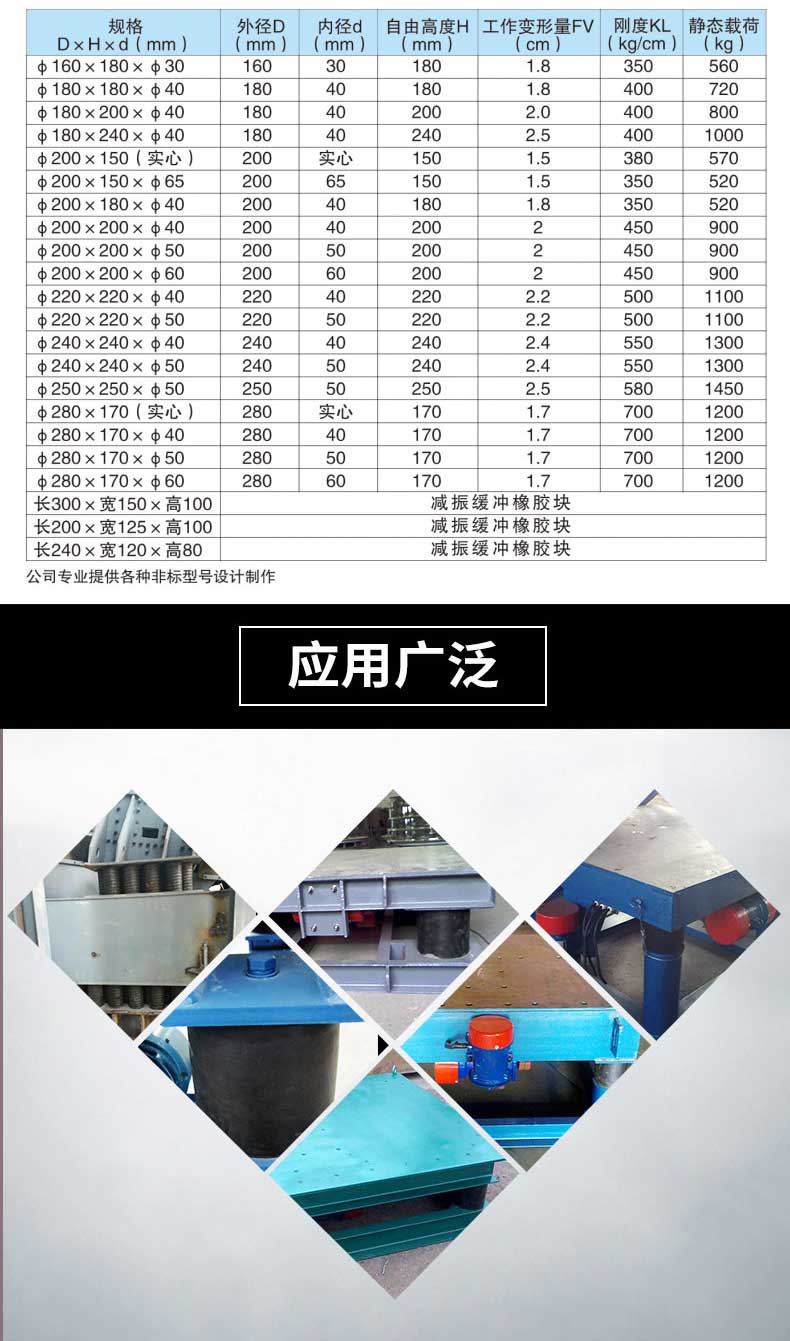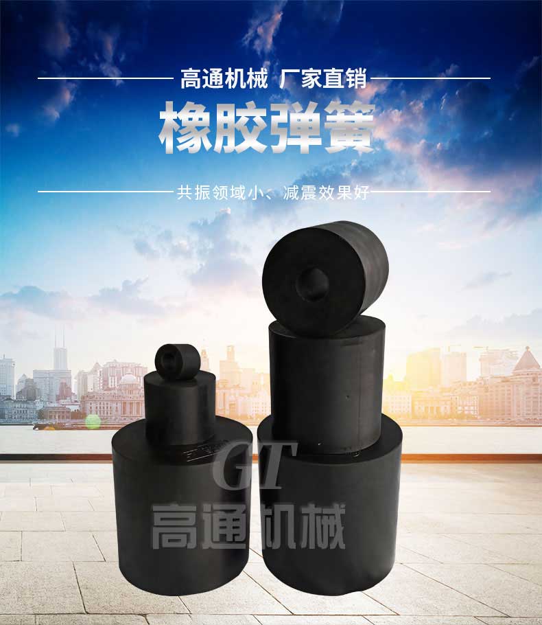 橡膠彈簧:是一種高彈性體,制作材料有普通橡膠。橡膠彈簧彈性模量小,受載后有較大的彈性變形,借以吸收沖擊和振動。它能同時受多向載荷,但耐高溫性和耐油性比鋼彈簧差。如有特殊要求可用耐油橡膠制成。該產(chǎn)品減振效果好,共振領(lǐng)域小,使用壽命長,成本低,還有良好的耐寒性,優(yōu)良的氣密性,防水性,電絕緣性,是減振的最佳選擇。